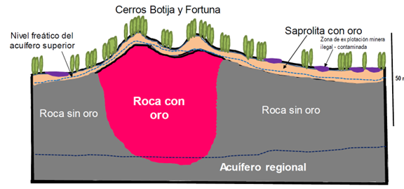 Por un lado, existe el yacimiento primario, asociado a la roca dura donde el oro se encuentra diseminado o en vetas hidrotermales. Este es el tipo de mineralización que dio origen al proyecto minero industrial originalmente planteado en los cerros Botija y Fortuna.
